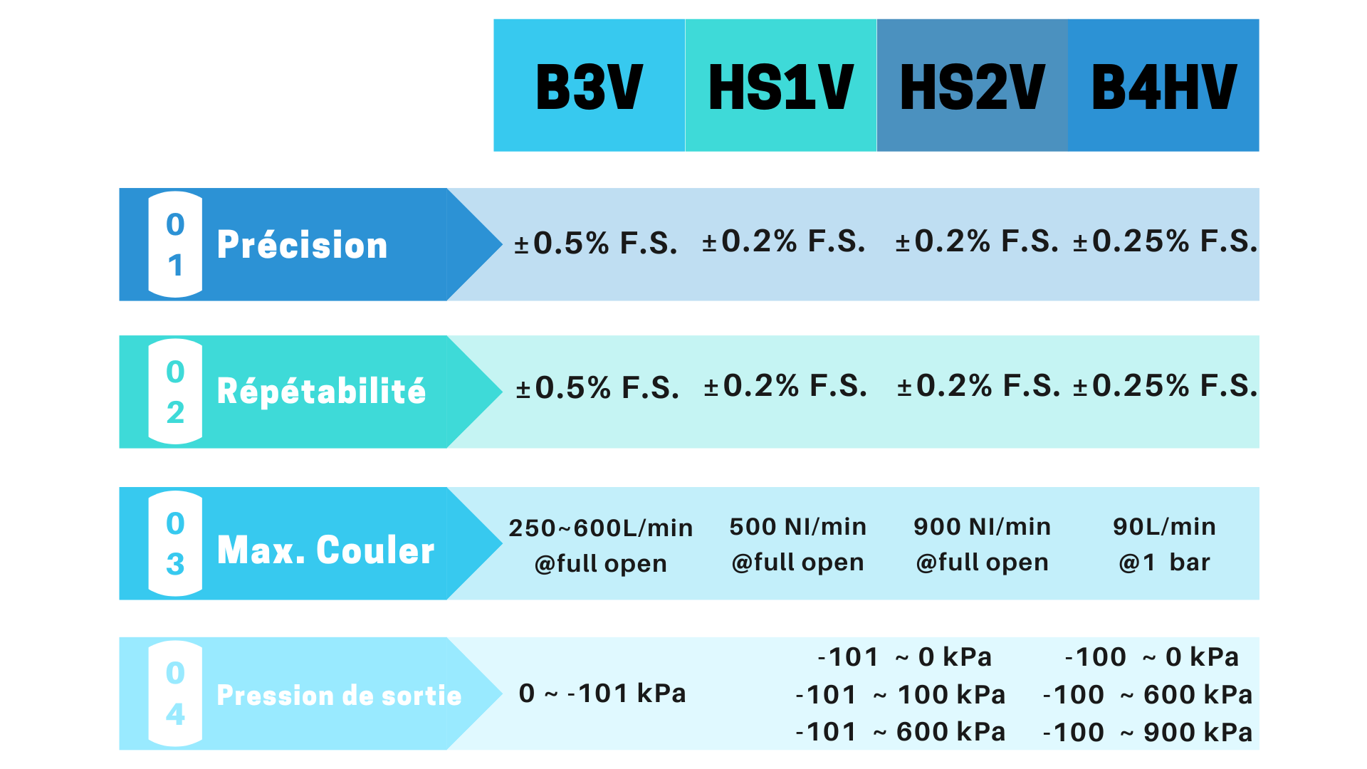 | Précision | ±0.5% F.S. | ±0.2% F.S. | ±0.2% F.S. | ±0.25% F.S. |