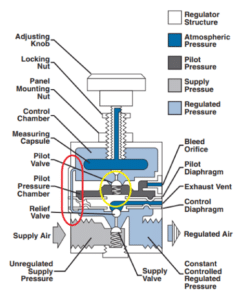 La capsula si trova in una camera di controllo circondata dalla pressione di uscita. Nel dispositivo è presente un canale (cerchiato in rosso) che alimenta questa camera con la pressione di uscita. La molla di avvio (cerchiata in giallo) agisce come forza sulla valvola di alimentazione che la mantiene costantemente leggermente aperta e non permette all'unità di andare a 0 PSI. La pressione è solitamente di circa 1 psi e può essere considerata come una pressione di avvio o di innesco, in quanto alimenta il dispositivo con l'aria in movimento. Senza questa molla, l'unità sarebbe in grado di raggiungere un'uscita di 0 PSI. Tuttavia, se l'unità non avesse questa molla, il dispositivo si affiderebbe alla pressione di alimentazione per alimentare la camera di controllo.