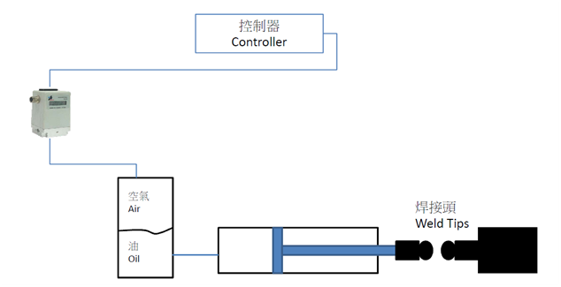 In questo schizzo, il regolatore di pressione proporzionale elettronico QKL (convertitore I/P) controlla la pressione dell'aria rispetto all'olio per controllare la pressione dell'olio nel cilindro. Sullo scarico del cilindro viene utilizzato un orifizio per ammorbidire la punta della saldatura e controllare la velocità complessiva durante il processo.