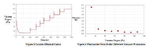 Şekil 5'teki eğrinin kontrol etkisi dalgalanma ile temsil edilir ve dalgalanma Şekil 6'da gösterildiği gibi farklı vakum basınçları altında elde edilir. Şekil 6'dan görülebileceği gibi, tüm basınç aralığında sadece 12Pa kontrol edildiğinde, oynaklık 1%'den fazladır. Açıkçası, 68Pa kendi kendine ayarlanan PID parametrelerinin 12Pa basınç kontrolüne uygulanması uygun değildir. Ayrıca ayrı PID parametresi kendi kendine ayarlama gerektirir.
