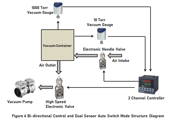 Vakum kontrolünde, aşağı akış kontrol yöntemi atmosfer basıncına yakın vakum derecesi için daha uygunken, 10 mbar'dan az vakum kontrolü yukarı akış emme kontrol yöntemi gerektirir. Bu nedenle, vakumun tam kontrol derecesini karşılamak için, Şekil 6'da gösterildiği gibi çift sensörlü çift yönlü kontrol yöntemi benimsenebilir.