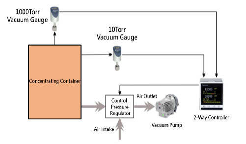 Şu anda, yaygın olarak kullanılan aşağı akış kontrol yöntemi, atmosferik basınca yakın basınca sahip konsantrasyon işlemi için daha uygundur, ancak 10 mbar'ın altındaki düşük basınçlı konsantrasyon işlemi için, yukarı akış hava emme kontrol yönteminin sokulması gerekir, yani konsantrasyon kabına bir hava giriş kanalı eklenir ve hava girişi bir elektronik iğne valfi ile kontrol edilir. Hava kanalının giriş akışı, basıncın hassas kontrolünü sağlamak için kullanılabilir.