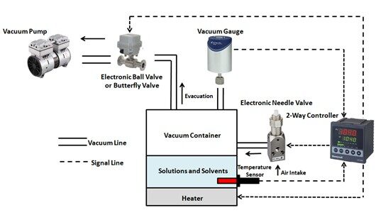 (3) In the vacuum evaporation and concentration process, many solvents and solutions are often corrosive to a certain extent, which requires the vacuum regulating valve to have good corrosion resistance. In order to solve the requirement of reducing solvent loss in the evaporation and concentration process, this article proposes a solution for precise control of vacuum degree, including the use of electronic flow control valve with strong corrosion resistance as vacuum degree control valves.