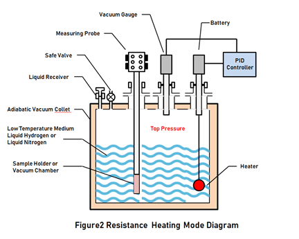 Düşük sıcaklık sabit sıcaklık kontrol işleminde, direnç ısıtma yöntemi, düşük sıcaklık ortamına bir direnç teli ısıtıcısı yerleştirmektir. Şekil 2'de gösterildiği gibi, vakum ölçer üst hava basıncındaki değişikliği algılar ve PID kontrolörü, üst hava basıncını ayarlanan değerde sabit tutmak için ısıtma akımını değiştirerek üst hava basıncını ayarlar ve kontrol eder. Şekil 2'den görülebileceği gibi, direnç ısıtma yöntemi üst basıncın sıcaklık kontrol yöntemi için daha uygundur, ancak basınç düşürülemez ve soğutulamaz.