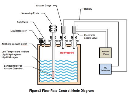 Akış kontrol modu tipik bir dekompresyon soğutma modudur. Şekil 3'te gösterildiği gibi, vakum pompası, üstteki hava basıncını azaltmak için kriyostatı sürekli olarak belirli bir pompalama hızında çeker. Vakum ölçer, elektronik pnömatik akış kontrol valfi ve PID kontrolörü kapalı döngü kontrol döngüsünü oluşturur. FC serisi elektronik pnömatik akış kontrol valfi hava akışını düzenler ve üst hava basıncını vakum altında doğru ve sabit tutar. Akış kontrol yönteminin, üstteki hava basıncını azaltan soğutma ve sıcaklık kontrol yöntemleri için daha uygun olduğu, ancak basınçlandırma ve ısıtma sağlayamadığı görülebilir.