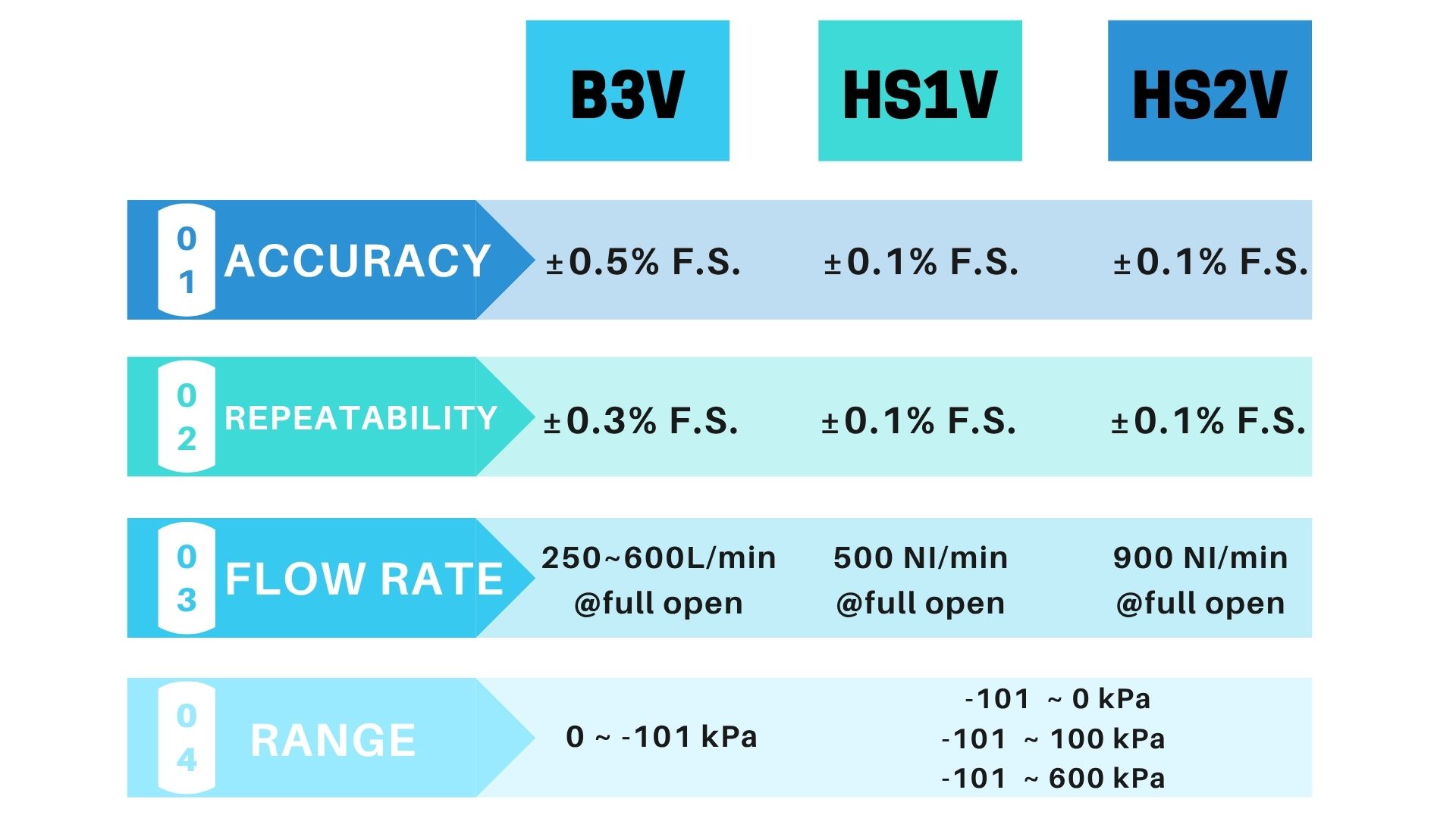 | Accuracy | ±0.5% F.S. | ±0.1% F.S. | ±0.1% F.S. |
